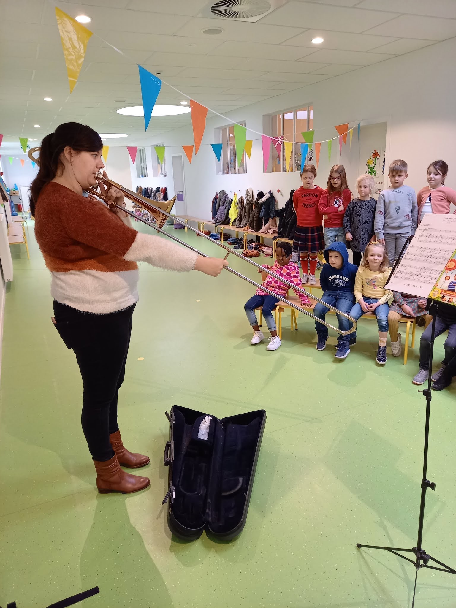 Onze laatste bezoekers met een instrument waren de eigen juffen van de 3de kleuterklassen. Juf Steffie bracht haar trombone mee. Ik bracht mijn micro mee want mijn instrument zit in mijn lichaam. Zo konden de kleuters dit alles ontdekken en luisteren naar een liedje dat we samen brachten.